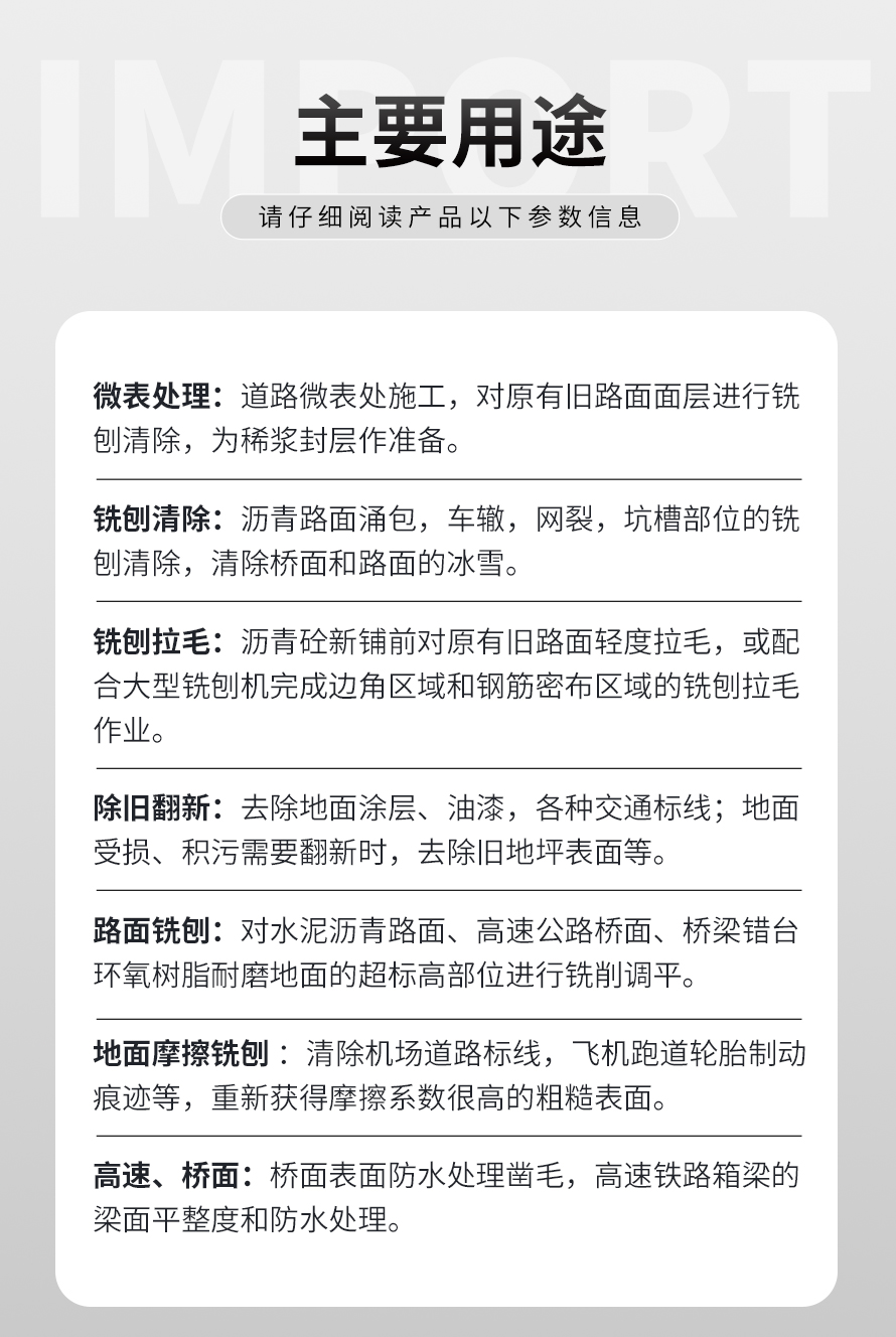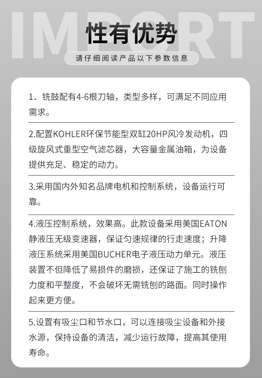 液壓銑刨機結(jié)構(gòu)緊湊,布局合理,具有控制精度高、性能穩(wěn)定、操作簡單、維護保養(yǎng)方便等優(yōu)勢。其適合各種強度較高的混凝土瀝青等高出部分的去除工作,是其它類型的銑刨機無法替代的產(chǎn)品。