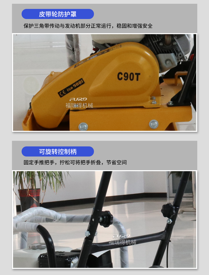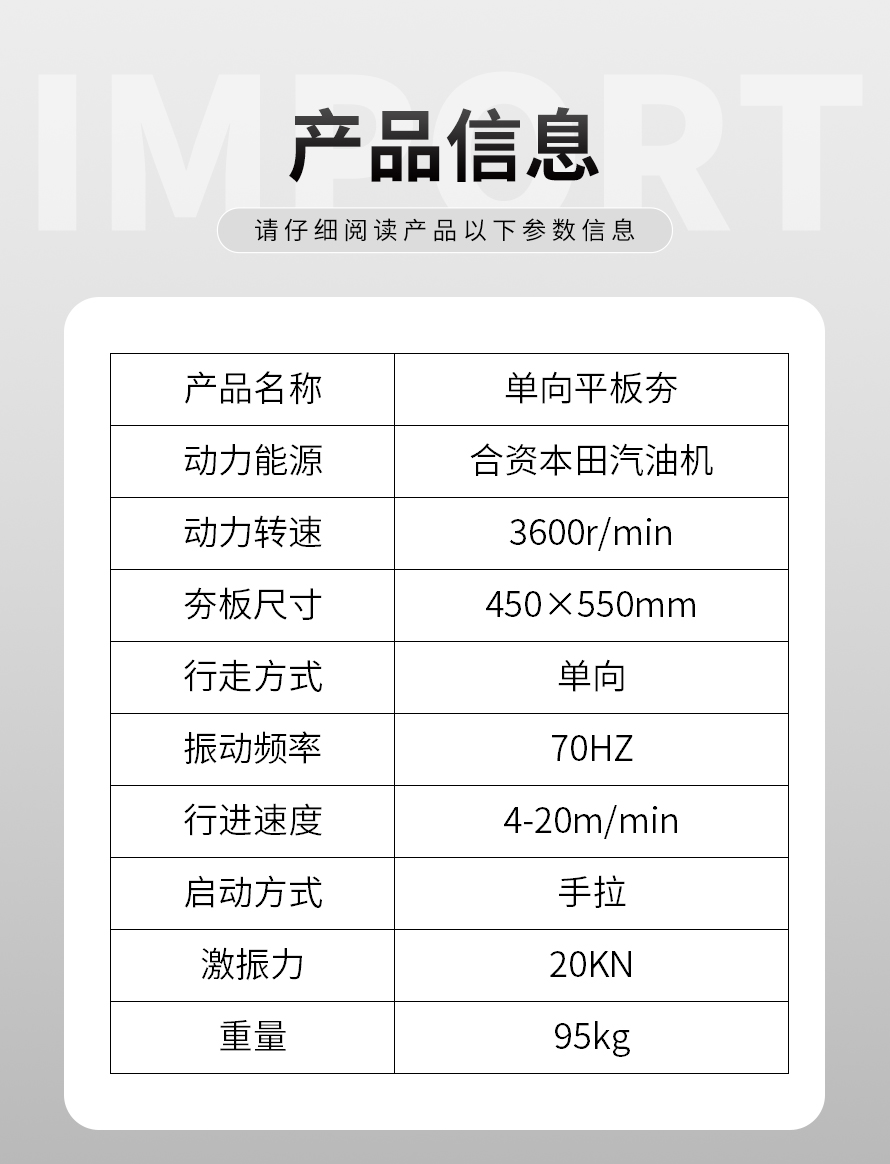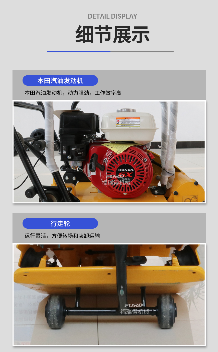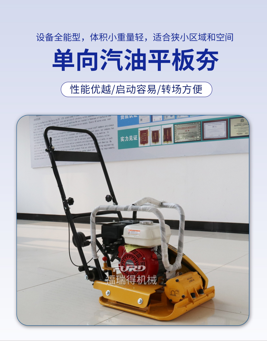 適用于路基邊緣、橋涵、管道、溝槽底部等狹長地帶的壓實。 本田汽油動力,名牌品質保證。